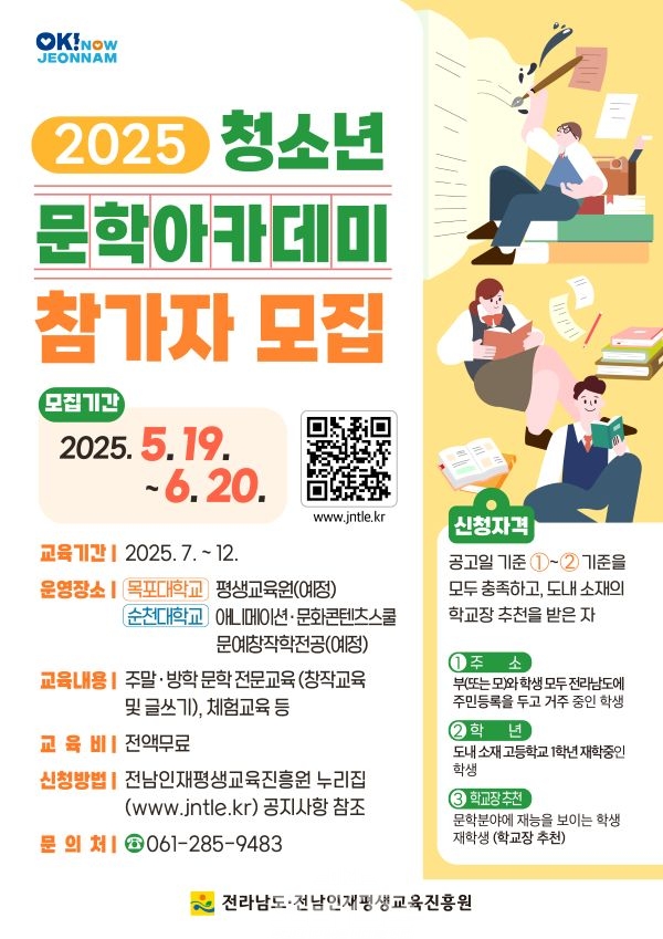 전라남도와 전남인재평생교육진흥원은 문학에 재능이 있는 고등학생을 발굴·육성하기 위한 ‘2025 청소년 문학아카데미’를 운영키로 하고, 6월 20일까지 참가자를 모집한다고 밝혔다.