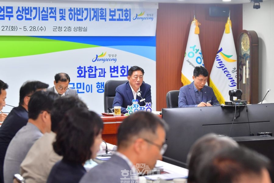 장성군이 27~28일 양일간 군청 상황실에서 ‘2025년 군정 상반기 실적 및 하반기 계획 보고회’를 가졌다. 총 375건의 군정 주요사업을 △행정‧관광‧체육 △복지‧농업 △건설‧산업 3개 그룹으로 나눠 분야별 핵심 성과와 향후 과제를 점검했다.
