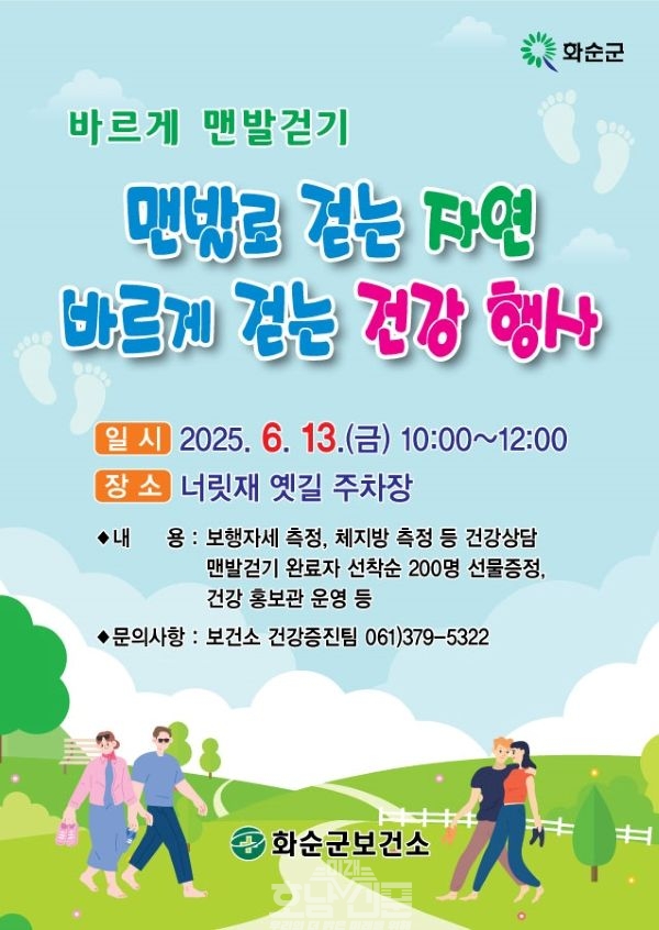 화순군(군수 구복규)은 군민의 건강 증진을 위해 오는 6월 13일 10시부터 12시까지 너릿재 옛길에서 ▲보행 자세 측정 ▲맨발 걷기 체험 ▲건강생활 홍보관을 결합한 통합 건강 행사를 개최한다고 30일 밝혔다.