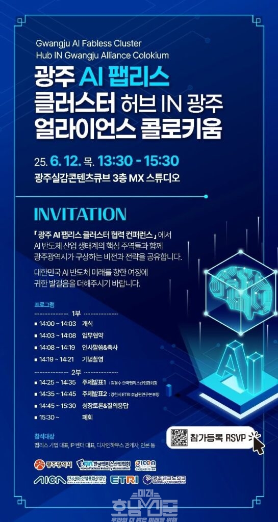 광주광역시(시장 강기정)는 오는 12일 광주실감콘텐츠큐브(GCC) 3층 MX스튜디오에서 ‘광주 AI 팹리스 클러스터 협력 컨퍼런스’를 개최한다.