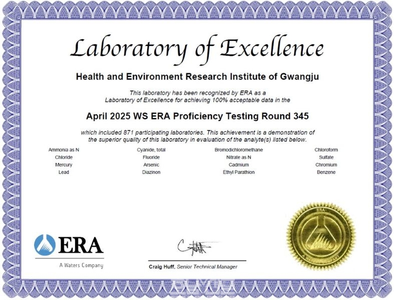 광주광역시 보건환경연구원은 미국환경자원학회(ERA)가 주관하는 ‘먹는물 분야 국제숙련도 시험’에서 11년 연속 최우수 분석기관 국제인증을 획득했다.