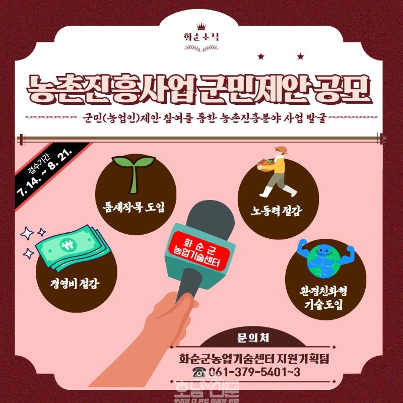 화순군(군수 구복규)은 2026년도 농촌진흥분야 신규사업 발굴을 위해 군민 제안 공모를 진행한다고 15일 밝혔다.