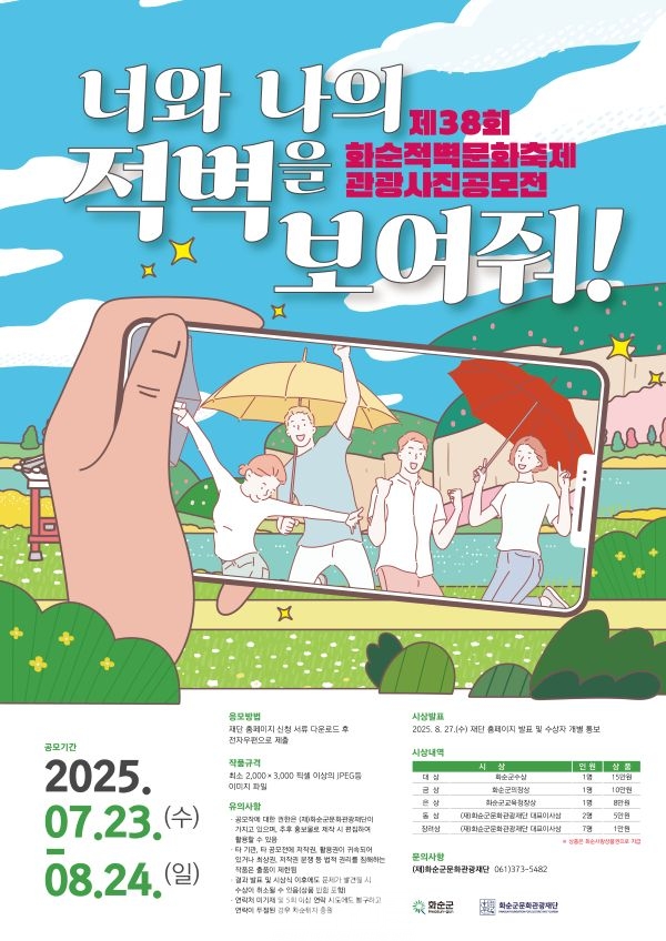 시상식은 오는 9월 20일(토) 화순적벽문화축제 행사장에서 열릴 예정이며, 대상(화순군수상) 수상작에 화순사랑상품권 15만 원을 비롯해 총 12명에게 시상금이 지급된다.