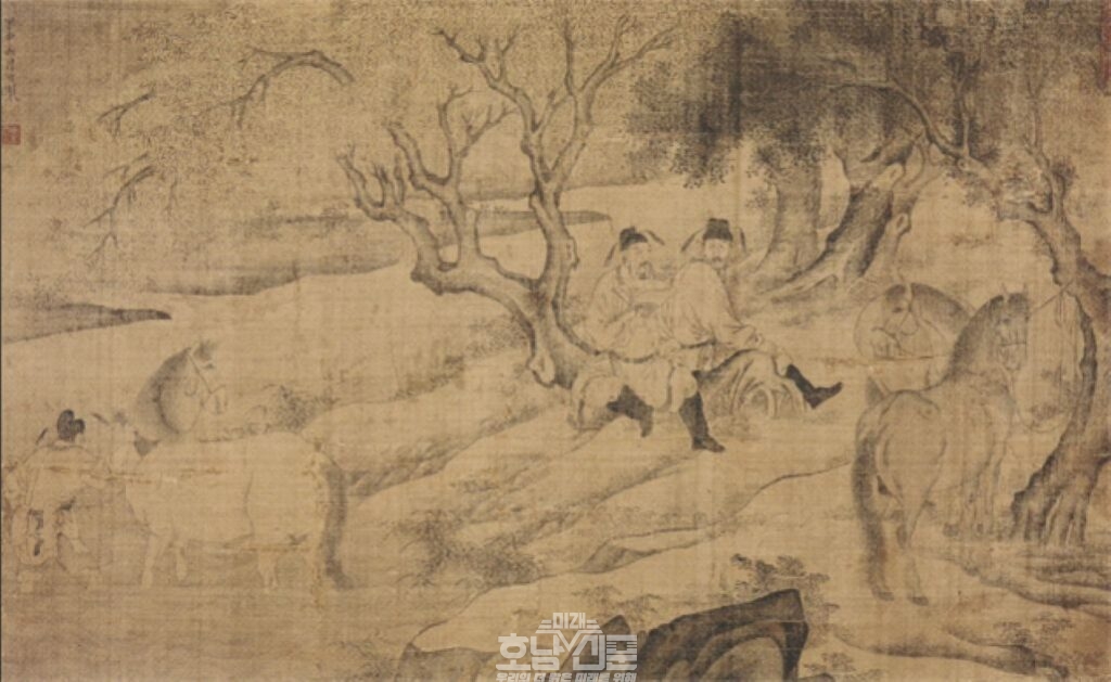 말을 매어두고 나무 밑에서 휴식을 취하는 두 명의 관리와 강에서 말을 목욕시키는 마부를 소재로 한 그림은 현전하는 공재의 말 그림 중 규모가 가장 크다.