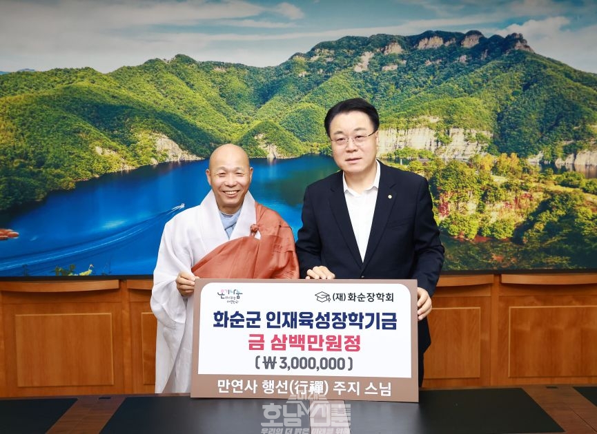 화순군(군수 구복규)은 지난 11일 전통 사찰 만연사 행선 주지스님이 (재)화순장학회에 지역 인재 육성을 위한 장학금 300만 원을 기부했다고 밝혔다.