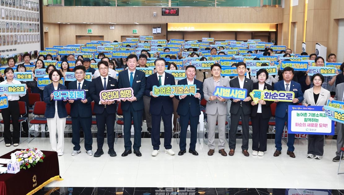 이번 결의대회는 인구 감소와 고령화 등으로 침체된 농촌 지역에 활력을 불어넣기 위해 정부가 추진 중인 ‘농어촌 기본소득 시범사업’의 대상지로 화순군이 선정될 수 있도록 결의를 다지는 자리였다.