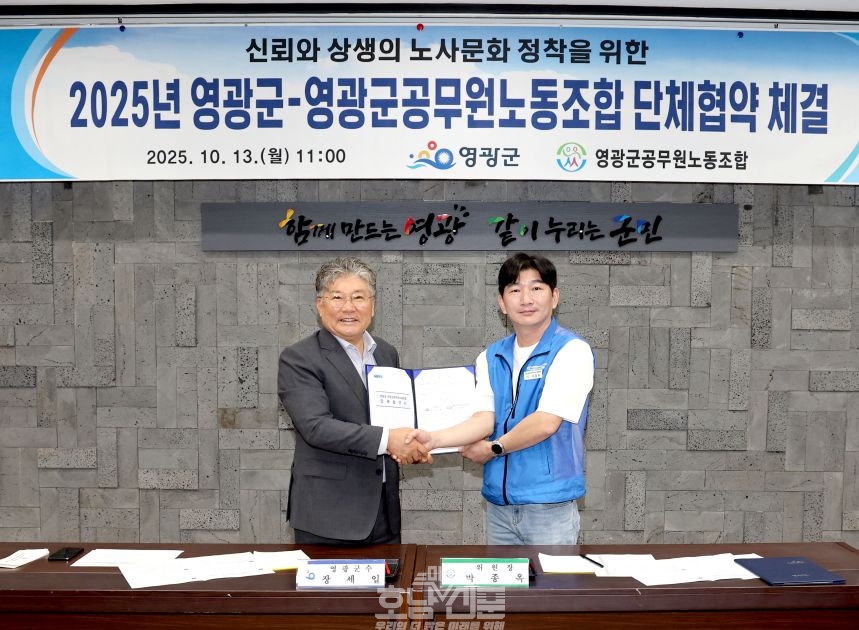 영광군(군수 장세일)은 지난 10월 13일 군청 2층 소회의실에서 영광군공무원노동조합(위원장 박종옥)과 “2025년 단체협약식”을 체결했다.