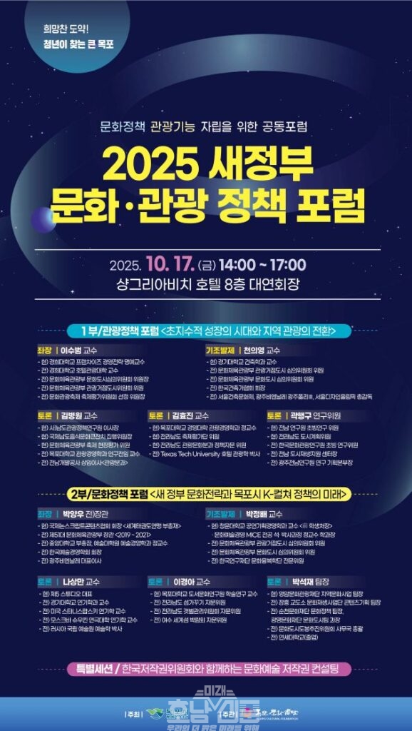 목포시와 (재)목포문화재단은 오는 10월 17일 오후 2시, 샹그리아비치호텔 8층 대연회장에서 ‘새정부 문화·관광 정책 포럼’을 개최한다.