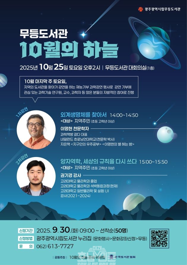 송경희 시립도서관장은 “이번 10월의 하늘 과학 강연을 통해 도서관이 새로운 배움과 영감을 전하는 장이 될 것”이라며 “앞으로도 다양한 프로그램을 이어가겠다”고 전했다.