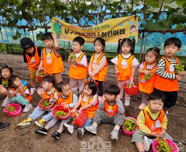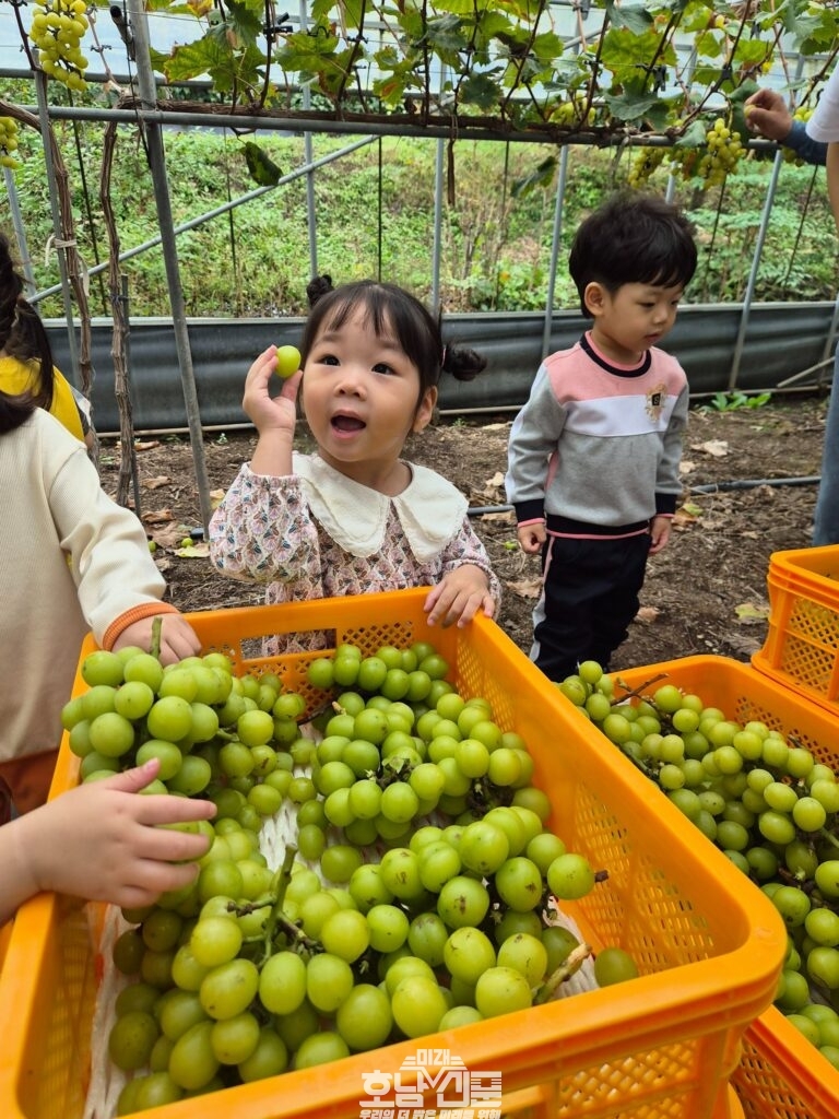 15일에도 광주시 남구 방림동의 남구 구립’카리타스 어린이집'(원장 최현미)에서 75명의 영유아들이 가을비가 내리는 궂은날씨에서도 샤인머스켓 재배하우스안에서 농촌의 향수를 마시며 수확의 기쁨을 담아냈다.
