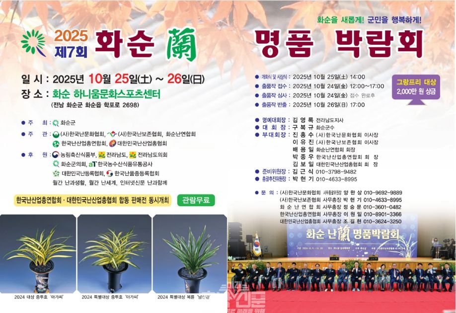 대한민국 난(蘭) 산업의 중심지로 자리매김하고 있는 전남 화순군(군수 구복규)이 ‘제7회 2025 화순 난 명품 박람회’를 오는 10월 25일(토)부터 26일(일)까지 이틀간 화순 하니움문화스포츠센터 실내체육관에서 개최한다.