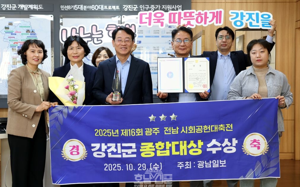 강진군이 2025년 광남일보에서 주관한 제16회 광주‧전남 사회공헌대축전에서 종합대상을 수상하는 영예를 안았다. 이번 수상은 군민이 중심이 되어 이웃과 지역을 위한 다양한 나눔 활동을 실천해온 강진군의 지속적이고 체계적인 사회공헌 노력이 결실을 맺은 결과다.