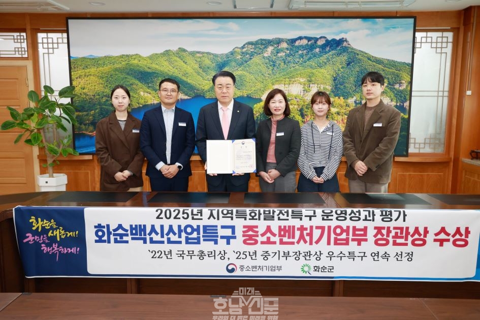 화순군(군수 구복규)은 중소벤처기업부에서 실시하는 ‘2025년도 지역특구 운영 성과 평가에서 화순백신산업특구가 ‘우수 특구’로 선정돼 중소벤처기업부 장관상의 영예를 차지했다고 10일 밝혔다.
