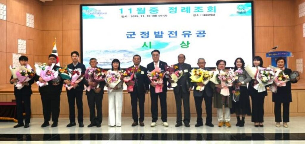 행사는 ▲군민의 날 및 가을꽃 축제 스케치 영상 시청 ▲군정 주요 성과 공유 ▲군정 발전 유공자 표창 시상 ▲직원 역량 강화 ‘5분 스피치’ 발표 등의 순으로 진행됐다.