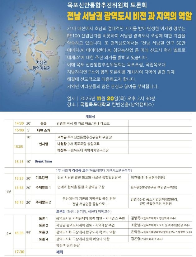 목포시는 목포신안통합추진위원회(위원장 고석규)가 주최하는 ‘전남 서남권 광역도시 비전과 지역의 역할 토론회’가 오는 20일 오후 2시 30분, 국립목포대학교 남악캠퍼스 컨벤션홀에서 개최된다고 밝혔다.