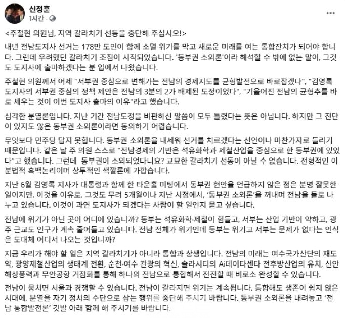신정훈 위원장 ( 나주화순 ) 은 페이스북을 통해 분열적 ‘ 동부권 소외론 ’ 에 유감을 표하고 , 전남 통합발전의 필요성을 강하게 강조했다 .