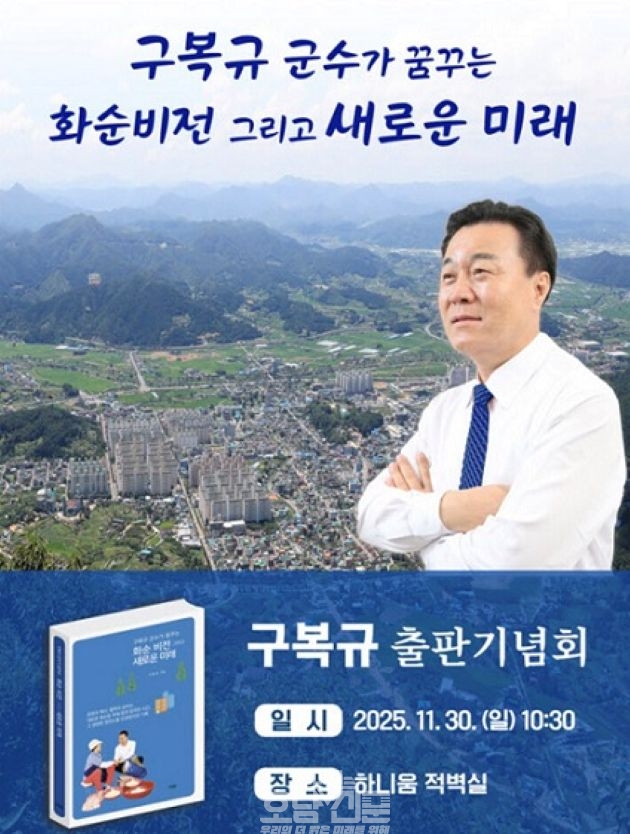 구복규 화순군수가 오는 11월 30일 오전 10시 30분 하니움 적벽실에서 『구복규 군수가 꿈꾸는 화순비전 그리고 새로운 미래』 출판기념회를 연다. 이번 출판기념회는 민선 8기 군정 과정에서 마련된 성과를 군민들과 공유하고, 화순이 앞으로 나아갈 방향을 제시하기 위한 자리로 마련됐다.