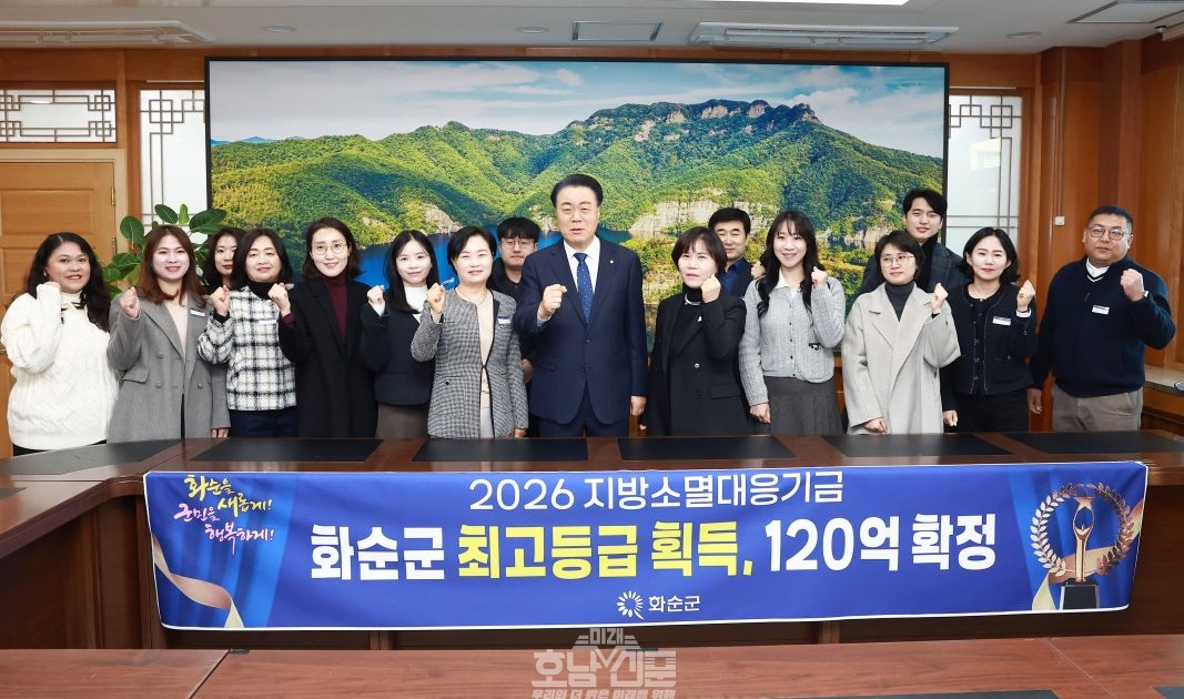 화순군(군수 구복규)은 2026년 지방소멸대응기금 투자계획 평가에서 ‘우수지역’으로 선정되어 최대 금액인 120억 원을 확보했다고 3일 밝혔다.