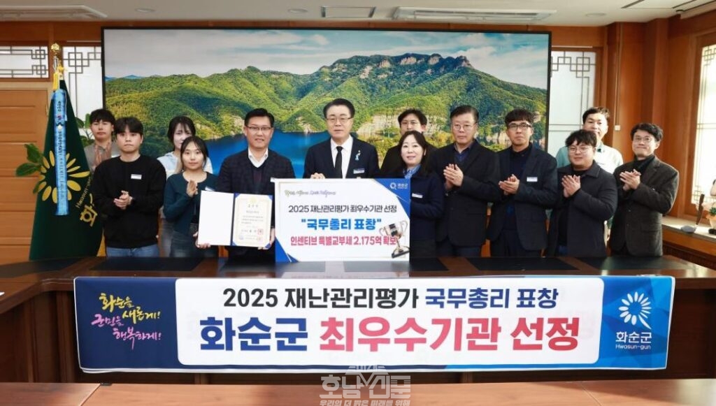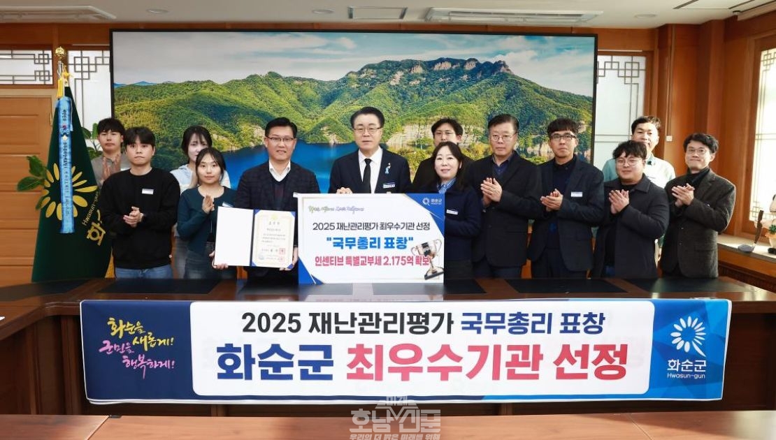 화순군(군수 구복규)은 30일 행정안전부가 주관한 ‘2025년 재난관리평가’에서 우수기관으로 선정돼 국무총리 표창과 함께 재정 인센티브로 특별교부세 2억 1,750만 원을 지원받게 됐다고 밝혔다.