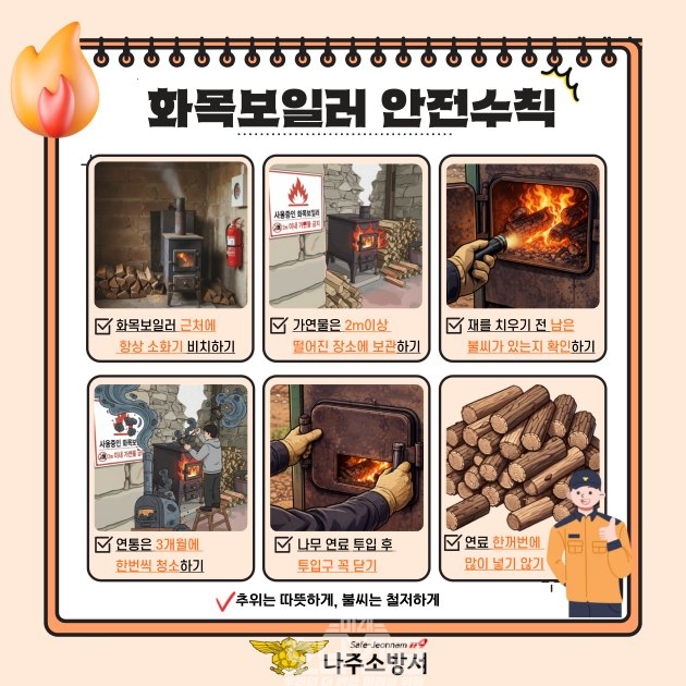 신향식 나주서장은 “화목보일러는 겨울철 따뜻함과 편리함을 제공하는 난방기기이지만 작은 부주의가 큰 화재로 이어질 수 있다”며“철저한 관리와 안전수칙 준수를 통해 안전한 겨울을 보내시길 바란다”고 전했다.