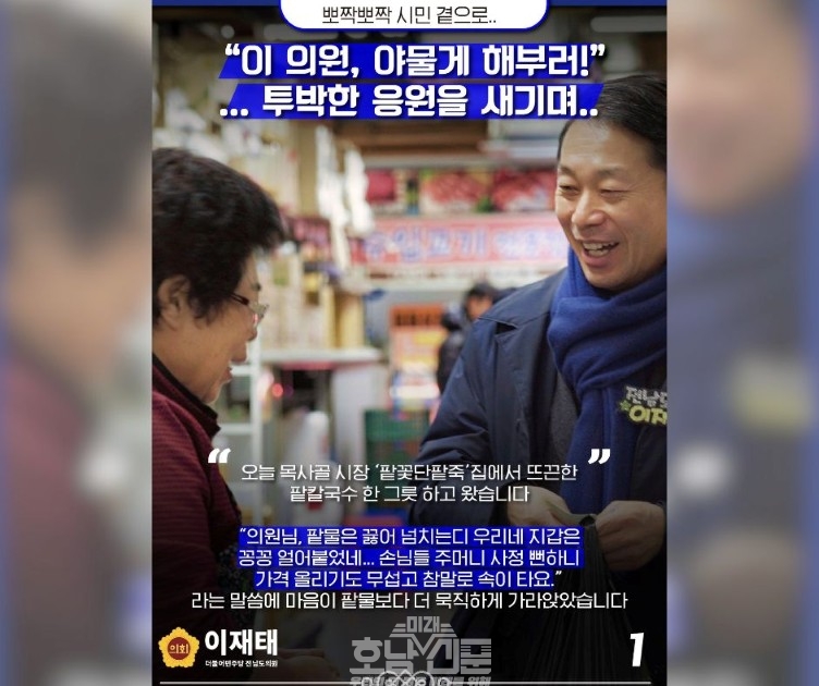 그러나 시장 골목에서 마주친 또 다른 장면은 분위기를 바꿨다. 상인이 그의 손을 꼭 잡고 건넨 말, “이 의원, 야물게 해부러!”라는 투박한 응원이었다. 이 의원은 이 한마디를 “다시 뛰게 만드는 힘”이라고 표현했다.