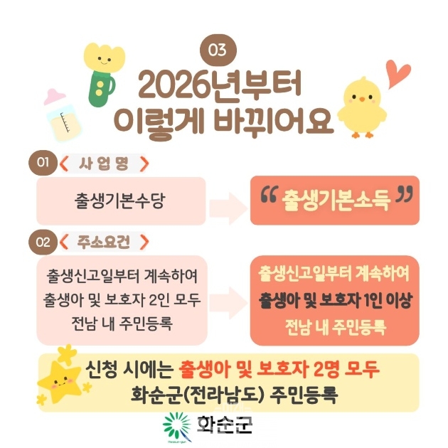 조미화 인구청년정책과장은 “사업 명칭을 기존 ‘출생기본수당’에서 ‘출생기본소득’으로 변경해 지원의 공공성을 더욱 강화했다”라며, “거주 요건 완화를 통해 더 많은 가정이 혜택을 받을 수 있도록 하고 아이 낳고 키우기 좋은 화순을 만들겠다”라고 전했다.