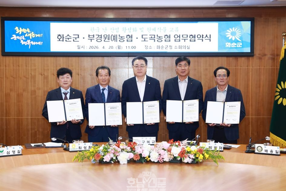 화순군(군수 구복규)은 지난 20일 부경원예농업협동조합(조합장 최성환), 도곡농업협동조합(조합장 박광재)과 함께 한국 난 산업 활성화 및 원예작물 교류를 위한 업무협약(MOU)을 체결했다고 밝혔다.