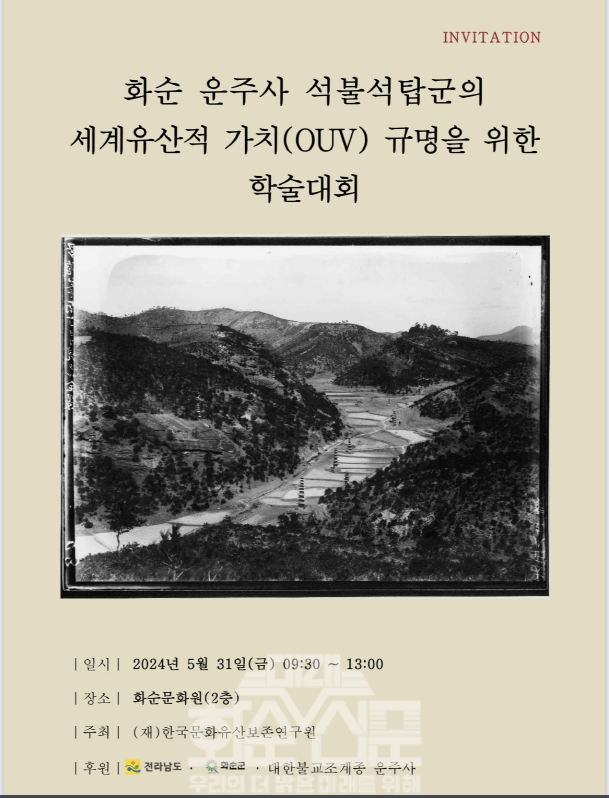 화순군(군수 구복규)은 운주사 석불·석탑군을 세계유산에 등재하기 위한 국내 학술대회를 2024년 5월 31일(금) 09:30에 화순 문화원 2층 강당에서 개최한다고 전했다.