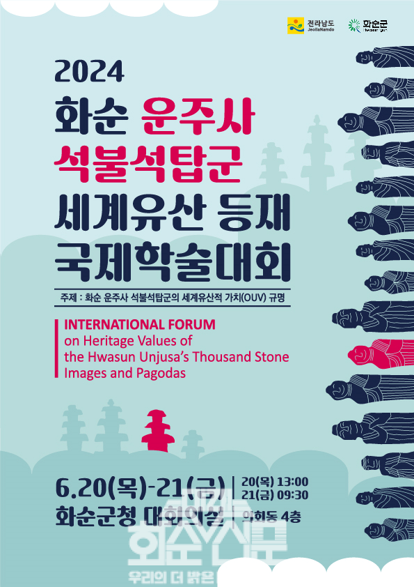 화순군(군수 구복규)은 13일 운주사 석불·석탑군을 세계유산에 등재하기 위한 국제 학술대회를 2024년 6월 20일(목) 13:00 ~ 6월 21일(금) 16:00까지 화순군청 4층 대회의실에서 개최한다고 전했다.
