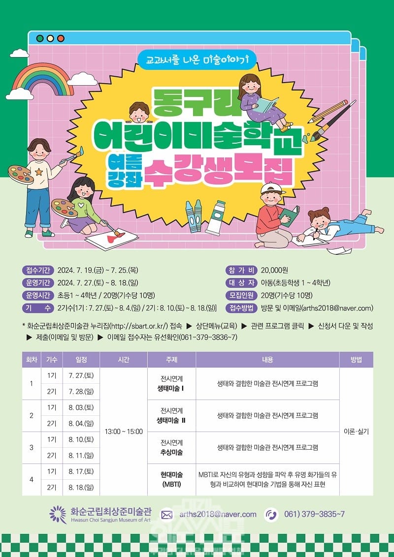 화순군(군수 구복규)은 18일 화순군립최상준미술관에서 7월 27일(토)부터 8월 18일(일)까지 초등학교 1~4학년을 대상으로 한 ‘동구리 어린이 미술학교’ 여름학기 수강생을 모집한다고 밝혔다.