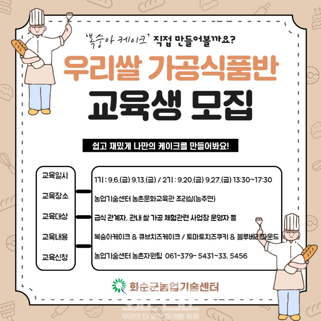 쌀 가공식품반은 9월 6일 개강하여 9월 27일까지 2기수로 운영되며, 기수별 20명씩 총 2회 4시간 진행할 예정이다. 교육 내용은 지역 농특산물을 활용한 디저트 개발로 복숭아케이크, 토마토치즈쿠키, 블루베리파운드 등 일상에서 다양하게 활용할 수 있는 실습으로 진행한다.