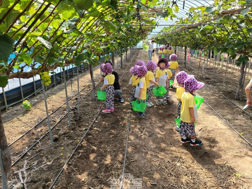 샘실농장의 샤인머스켓 하우스는 수확철을 맞아 방문한 어린이들로 활기가 넘쳤다.