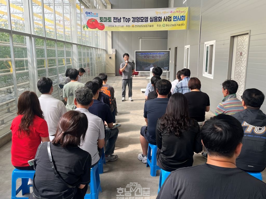 화순군(군수 구복규)은 27일 화순군 이양면 한 농가에서 ‘토마토 전남 TOP 경영모델 실용화 사업 연시회’를 30명이 참석한 가운데 전남농업기술원과 공동 개최했다고 밝혔다.