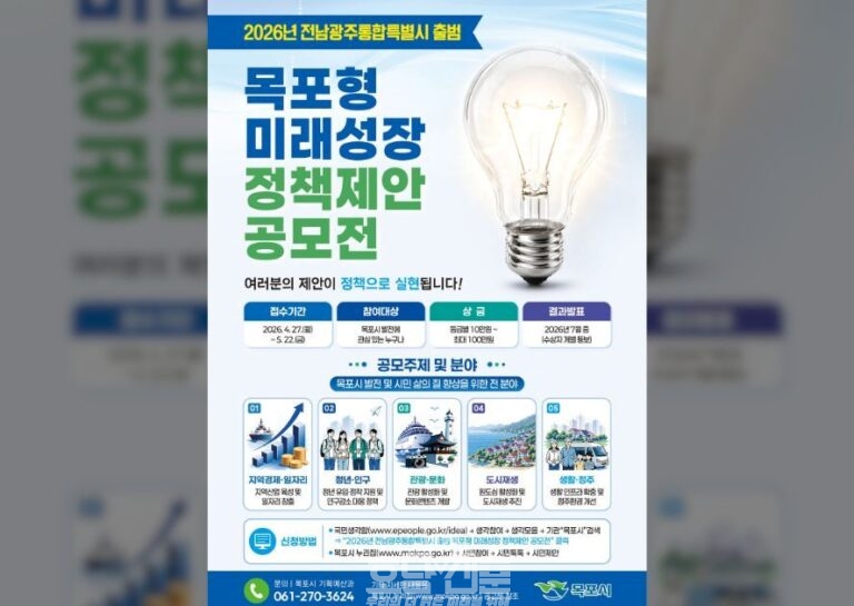 ...목포시가 전남·광주 통합특별시 출범에 대비하고 지역의 미래 성장동력을 발굴하기 위해 ‘목포형 미래성장 정책제안 공모전’을 개최한다. 이번 공모전은 시민과 국민의 창의적인 정책 아이디어를 시정에 반영하고, 변화하는