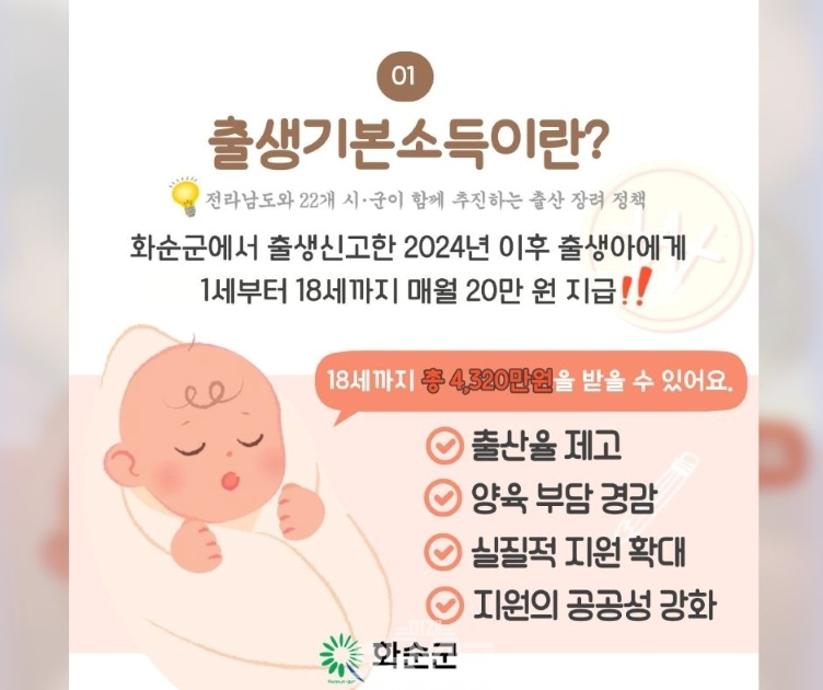 ...화순군(군수 구복규)은 20일 출산 장려와 양육 환경 개선을 위해 ‘출생기본소득 지원사업’의 신청 자격을 2026년부터 대폭 완화해 추진한다고 밝혔다. 이 사업은 출산 가정의 경제적 부담을 획기적으로