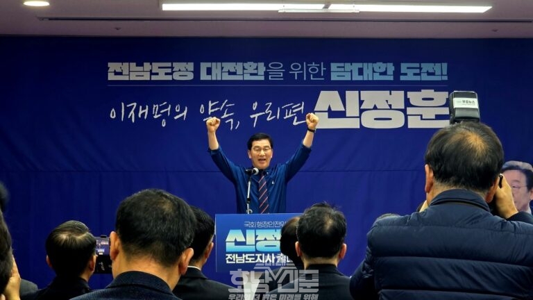 ...신정훈 국회 행정안전위원장(더불어민주당·나주·화순)이 8일 오전 11시 전남도의회 초의실에서 전라남도지사 출마를 공식 선언했다. 현장에는 약 1천여 명의 지지자가 참석하며 세 결집을 보여줬고, 배우 이기영 씨가 사회를