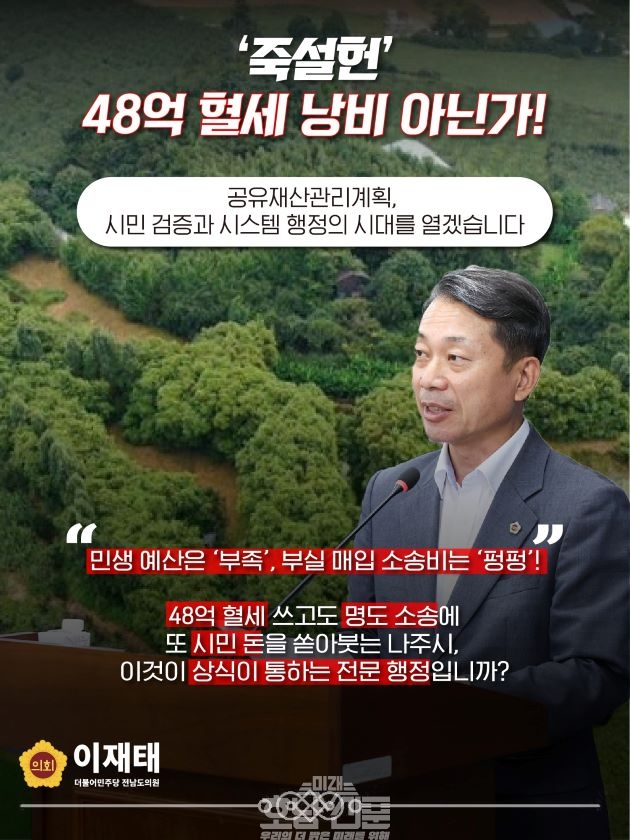 ...전라남도의회 이재태 의원이 나주시의 ‘금천 죽설헌 부지 매입’을 두고 48억 원 혈세 낭비 가능성을 제기하며, 공유재산관리 전반의 시스템 혁신을 촉구했다. 이재태 의원은 “나주시가 개인 정원인