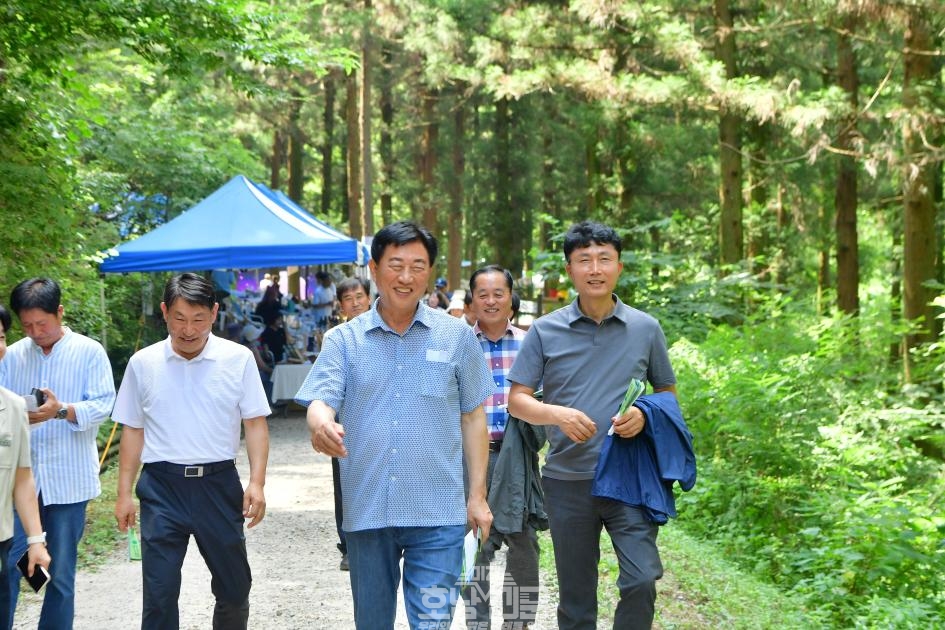 공직자, 관계자들과 함께 축령산 산림자원을 확인 중인 김한종 장성군수