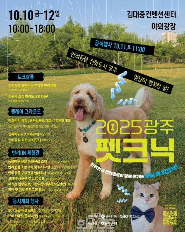 광주광역시(시장 강기정)는 오는 10월 10일부터 12일까지 사흘동안 김대중컨벤션센터 야외광장에서 반려인과 반려동물이 함께하는 ‘2025 광주 펫크닉(pet+picnic)’ 행사를 개최한다. 광주관광공사가 주관하는 이번 행사는 ‘반려동물친화도시, 멍냥이 행복한 날!’을 주제로 ‘광주펫&캣쇼’, ‘플리마켓’과 연계해 다채로운 프로그램을 선보인다. 특히 11일 공식행사에서는 재즈 공연으로 가을 분위기를 더하고, 동물복지정책 유공 표창, 시민 참여 퍼포먼스가 진행된다. 참가자들은 ▲심폐소생술(CPR) 교육 ▲반려동물 상식 오엑스(OX)퀴즈 ▲수의사 토크… 광주시, 멍냥이 행복축제 ‘펫크닉’ 연다 계속 읽기