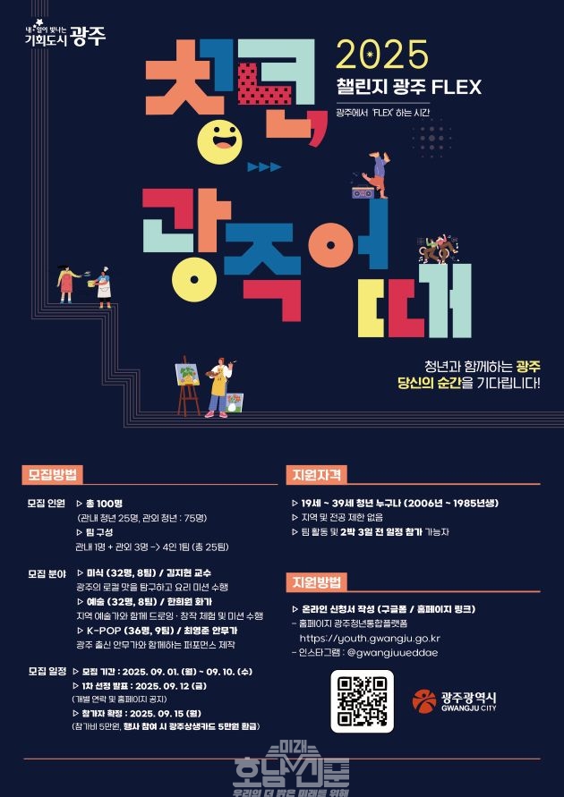 광주광역시(시장 강기정)는 오는 9월 26일부터 28일까지 전국 청년 100명을 대상으로 2박3일간 광주를 직접 경험하는 ‘청년, 광주 어때’ 프로젝트를 진행한다. 이 프로젝트는 ‘챌린지 광주 플렉스(FLEX)’를 주제로, 참가자들이 미식·예술·케이팝 등 세 가지 분야 가운데 하나를 선택해 광주만의 매력을 깊이 체험할 수 있도록 기획됐다. 행사 기간에는 ‘2025 광주청년주간’과 광주청년센터 주관 ‘청년교류총회’가 함께 열려 지역 청년들과 교류 기회도 마련된다.… “청년, 광주 어때”…광주시, 사흘살기 운영 계속 읽기
